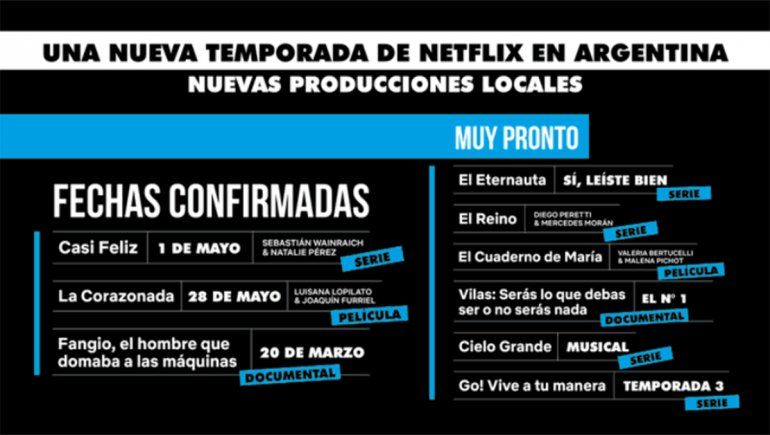 Respecto de las fechas de estreno, el documental "Fangio, el hombre que domaba las máquinas", basado en un estudio que realizó en 2016 la Universidad de Sheffield y que determinó que Juan Manuel Fangio es el mejor piloto de F1 de la historia, llegará a Netflix el 20 de marzo.