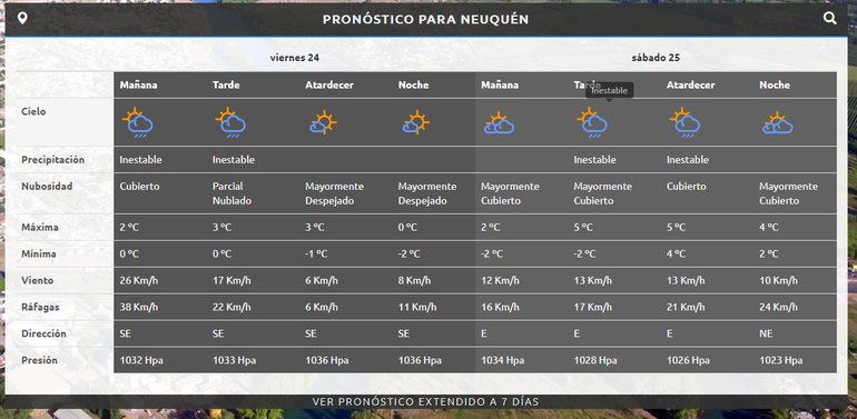 Este viernes se espera en Neuquén capital una jornada fresca con escasa amplitud térmica, la temperatura al amanecer y al anochecer no tendrá variaciones, con una máxima de 2 grados y una mínima de -2.