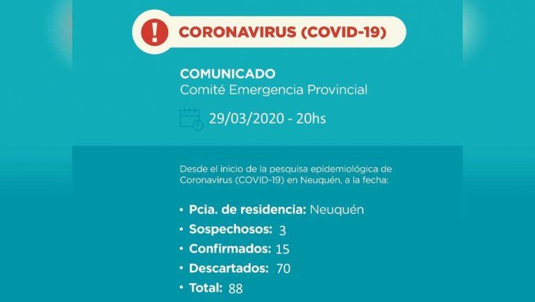 El Comité de Crisis de la Provincia confirmó este domingo tres nuevos positivos de coronavirus, totalizando 15 contagios en Neuquén. Lo llamativo es que el Ministerio de Salud de la Nación no había reportado positivos en el territorio provincial.