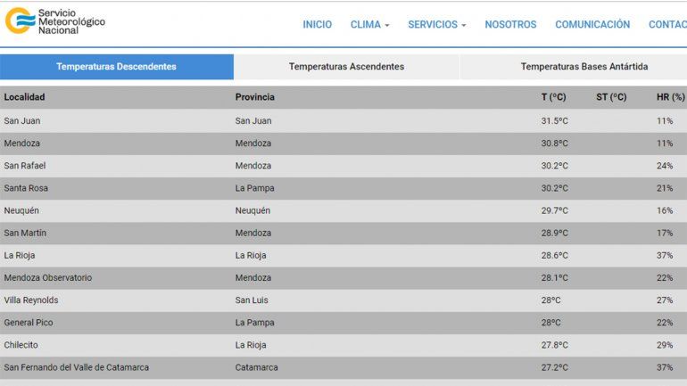 La lista la encabezó la ciudad de San Juan, con 31,5°C. Luego le siguió Mendoza con 30,8°C y San Rafael (también de la provincia de Mendoza), con 30,2°C.