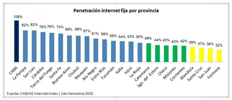 A nivel nacional, la jurisdicción con mayor penetración hogareña de Internet es la Capital Federal, que tiene 108 conexiones cada 100 viviendas. Eso implica que muchas familias cuentan con más de un servicio contratado.