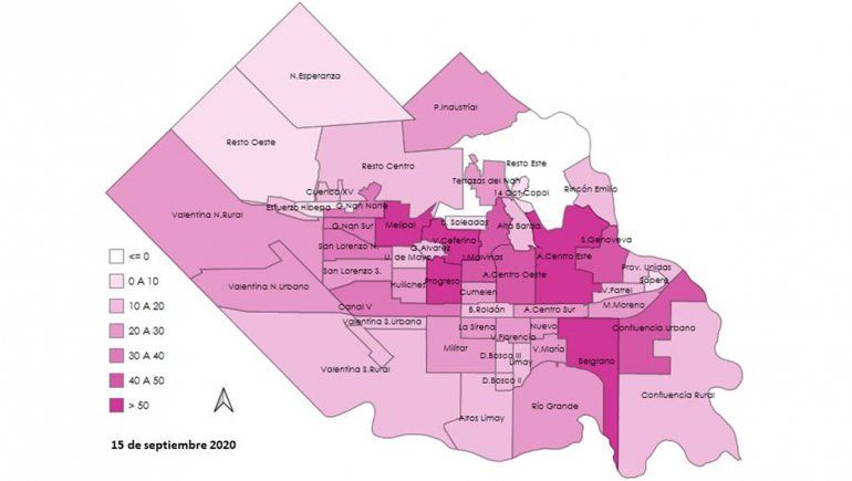 Hacia el norte, uno de los barrios con menor número de pacientes activos es Nueva Esperanza, que tiene a favor la lejanía respecto del casco urbano. También las tomas cercanas a la Autovía tienen un bajo índice de contagios y lo mismo ocurre en 14 de Octubre-Copol y Rincón de Emilio, dos barrios relativamente aislados.