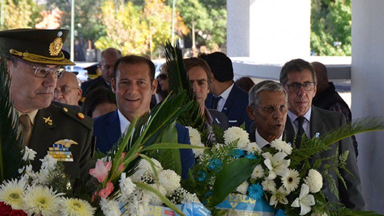 Representantes del Ejército, el comandante de brigada coronel mayor Pablo Chort, junto al gobernador Omar Gutiérrez y al intendente Horacio “Pechi” Quiroga, compartieron un acto en el cenotafio del Parque Central, que incluyó discursos y una ofrenda floral que fue depositada frente a las placas que consignan los nombres de los 649 soldados que perdieron la vida en la guerra.
