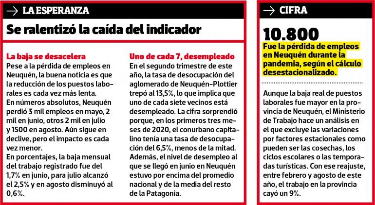 Según el último reporte del Ministerio de Trabajo nacional, Neuquén perdió el 10,7% de sus empleos registrados entre agosto de 2019 y el mismo período de este año. Es decir que hay un puesto laboral menos por cada diez que tenía en la primavera pasada.