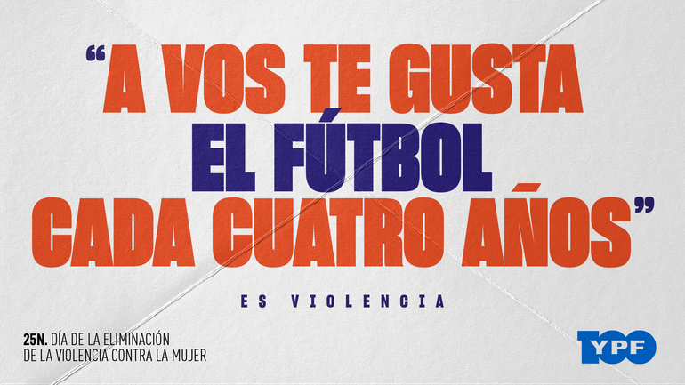 Con el claim “es violencia”, busca visibilizar hábitos, imaginarios y frases que están naturalizadas, pero son una expresión más de violencia de género. El enunciado principal, “a vos te gusta el fútbol cada cuatro años”, toma el contexto mundialista para poner de manifiesto esta violencia simbólica, junto a otros como “¿en serio ganás más que él?”, “trabajás un montón, ¿cómo te encargás de la casa?”.