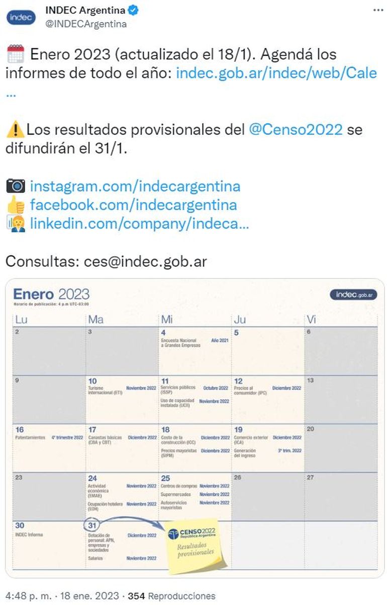 El Instituto Nacional de Estadísticas y Censos (Indec) confirmó este miércoles que el próximo martes 31 de enero difundirá los resultados provisorios del Censo 2022. El relevamiento, doce años después de la última vez, se llevó a cabo en mayo del año pasado.