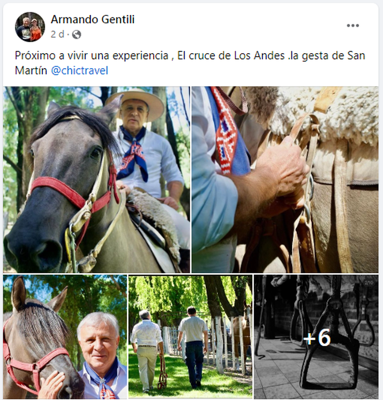 Siempre inquieto y multifacético, si algo le faltaba al odontólogo allense Armando Gentili era embarcarse en este atrapante desafío de cruzar la cordillera de Los Andes a caballo para emular a uno de sus grandes ídolos, el prócer José de San Martín que hizo historia con su gesta.
