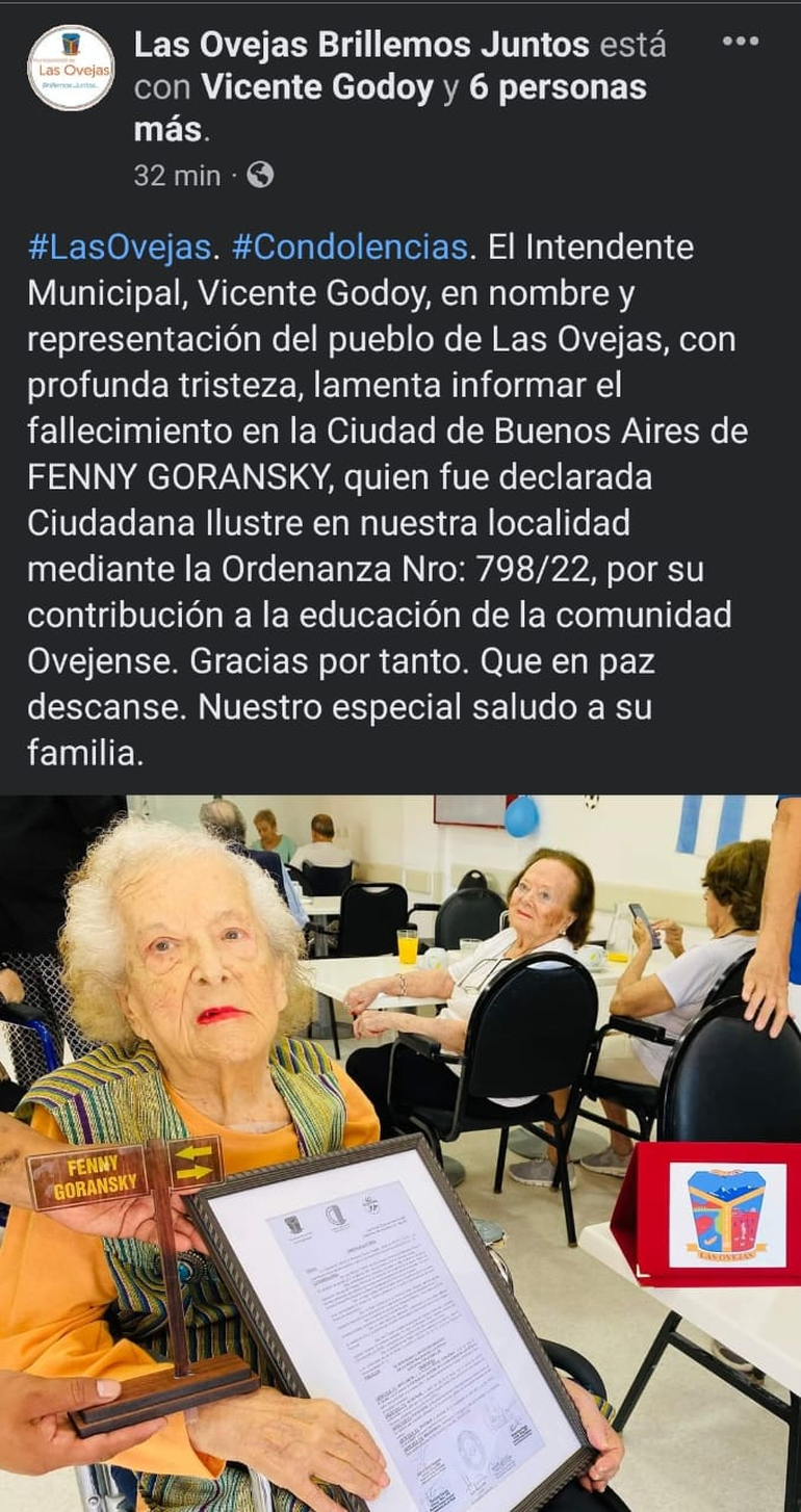 Días atrás, el municipio de Las Ovejas le tributó un sentido reconocimiento al inscribir con su nombre una de las calles de la localidad. En ese emotivo acto, del cual participó una de sus hijas, el intendente Godoy en su alocución expresó que “fue un honor inaugurar la calle Fenny Goransky, en homenaje a quien superando dificultades burocráticas hizo posible la creación de la primera Escuela de Educación Agropecuaria de la Provincia del Neuquén, nuestra actual EPEA N° 1”.
