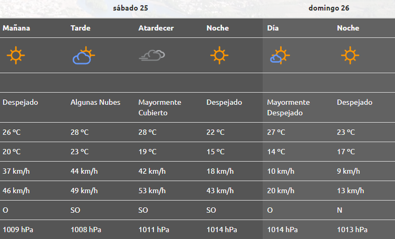 Luego la curva del viento disminuye un poco, pero no tanto. Hacia la noche y con el cielo cubierto de nubes, se esperan más vientos de entre 40 y 50 kilómetros por hora. Cede casi por completo el domingo, en lo que todo parece indicar que será una jornada agradable con temperaturas máximas de 27 grados centígrados y ráfagas que rondarían entre los 20 km/h por la mañana, con el cielo mayormente despejado.