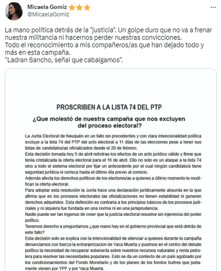 “Tenemos derecho a preguntarnos ¿qué mano hay en el gobierno provincial que está detrás de este fallo? Esta decisión solo se explica con la intencionalidad de silenciar a quienes durante la campaña denunciamos con fuerza la extranjerización de Vaca Muerta y pusimos en el centro del debate político la necesidad de recuperar soberanía sobre nuestros recursos naturales y renta petrolera para resolver las necesidades populares”, sostuvieron.
