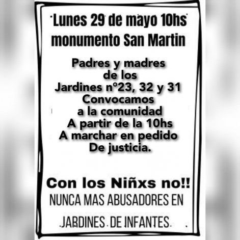Las familias de los estudiantes de los jardines de infantes donde denunciaron a docentes por presuntos abusos sexuales marcharán de manera conjunta el próximo lunes para exigir justicia para sus hijos. La movilización está convocada para las 10 en el monumento a San Martín y desde allí recorrerán el centro neuquino bajo la consigna de "nunca más abusadores en los jardines de infantes".