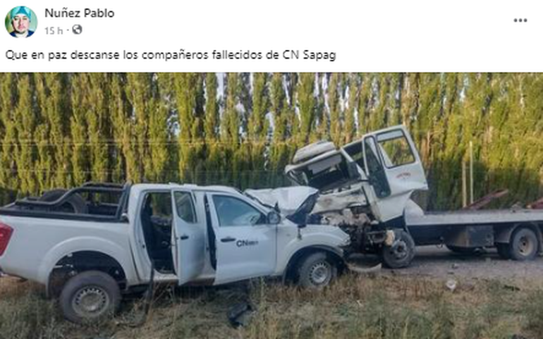 Se trata de dos jóvenes que trabajaban para CN Sapag. A pocos kilómetros de San Patricio del Chañar, un camión invadió el carril contrario y chocó a la camioneta donde iban las víctimas.