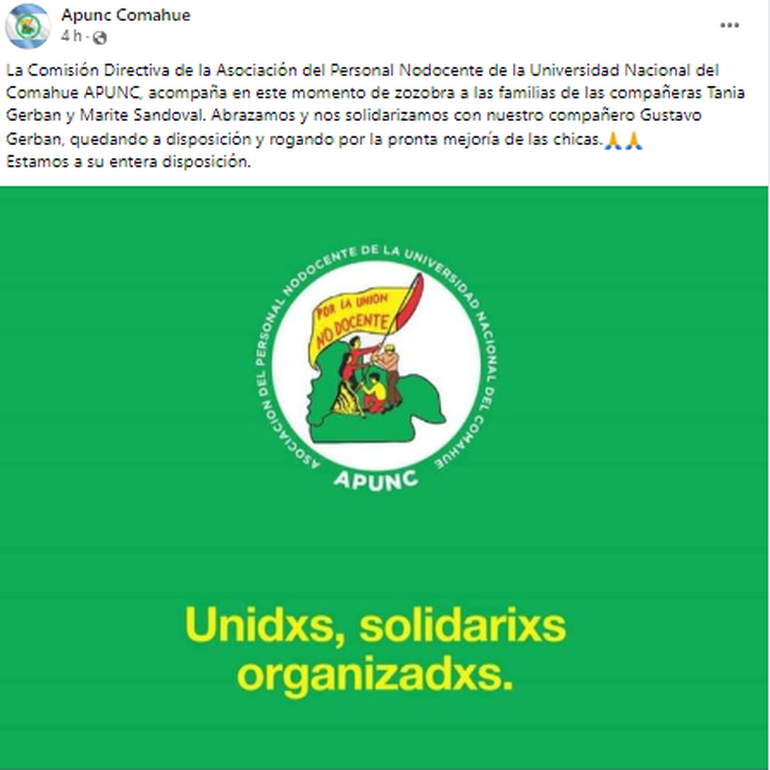 "Las autoridades siguen de manera permanente la evolución de los informes médicos. En tal sentido, se informa que en la presente jornada ambas trabajadoras -Marité Sandoval y Tania Gerbán- se encuentran internadas con cuadros reservados aunque estables y, acorde al sentir de esta casa, hace llegar un mensaje de pronta recuperación y una palabra de aliento a las familias", informaron en FADECS UNCo (Facultad de Derecho y Ciencias Sociales).