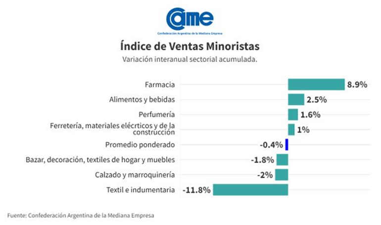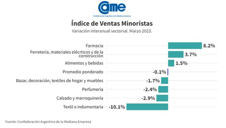 Así surge del Índice de Ventas Minoristas Pymes de la Confederación Argentina de la Mediana Empresa (CAME), elaborado en base a su relevamiento mensual entre 1.184 comercios minoristas de todo el país, realizado entre el 3 y 5 de abril.