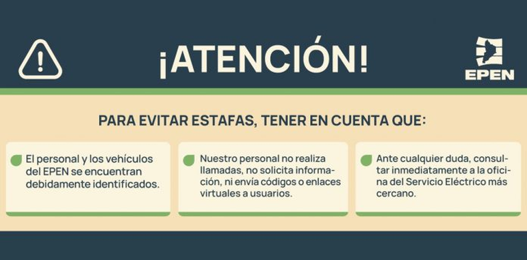 En este sentido, se comunica a la ciudadanía que el EPEN no realiza llamados de ningún tipo, no solicita información, no envía códigos ni enlaces virtuales ni datos, no acude a domicilios (salvo en caso de que el vecino realice un reclamo), y tanto el personal como los vehículos de la empresa se encuentran debidamente identificados.