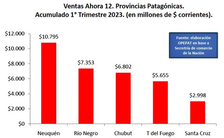 En el análisis interanual de las ventas del programa, el OETEP detectó que mientras en el total país se registro una caída de la cantidad de operaciones realizadas bajo el programa Ahora 12, en todas las provincias patagónicas se verificó un aumento respecto al mismo trimestre del año pasado. En Tierra del Fuego aumentaron 15% interanual; en Neuquén, 14%; en Chubut, 13%; en Santa Cruz, 8%, y en Río Negro, 6%.