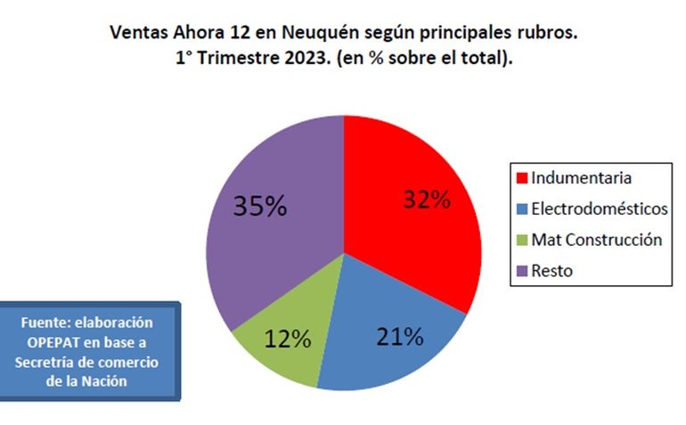En Neuquén el rubro Indumentaria representó una proporción mayor en el total de la ventas que en el resto de las provincias patagónicas, llegando al 32% de las compras que hicieron los consumidores mediante el programa Ahora 12. El rubro Electrodomésticos acaparó el 21% y el de materiales de construcción, el 12%.