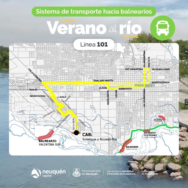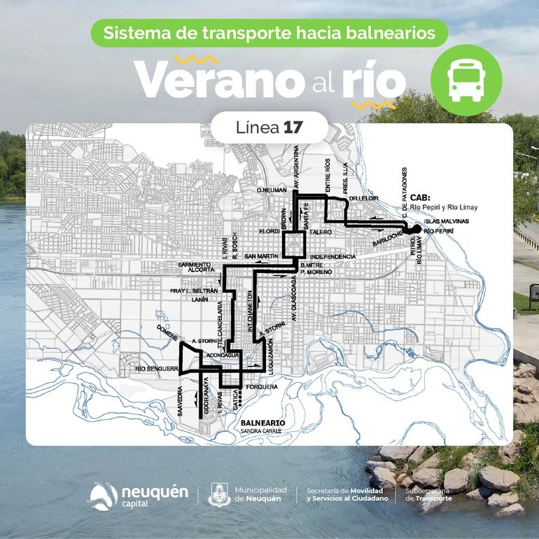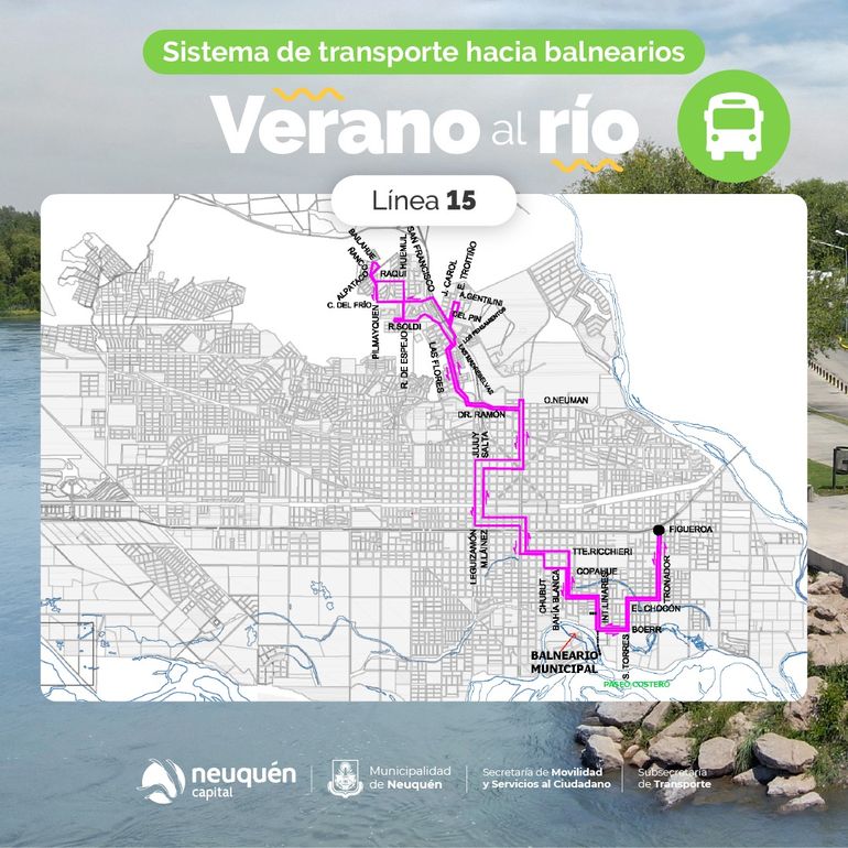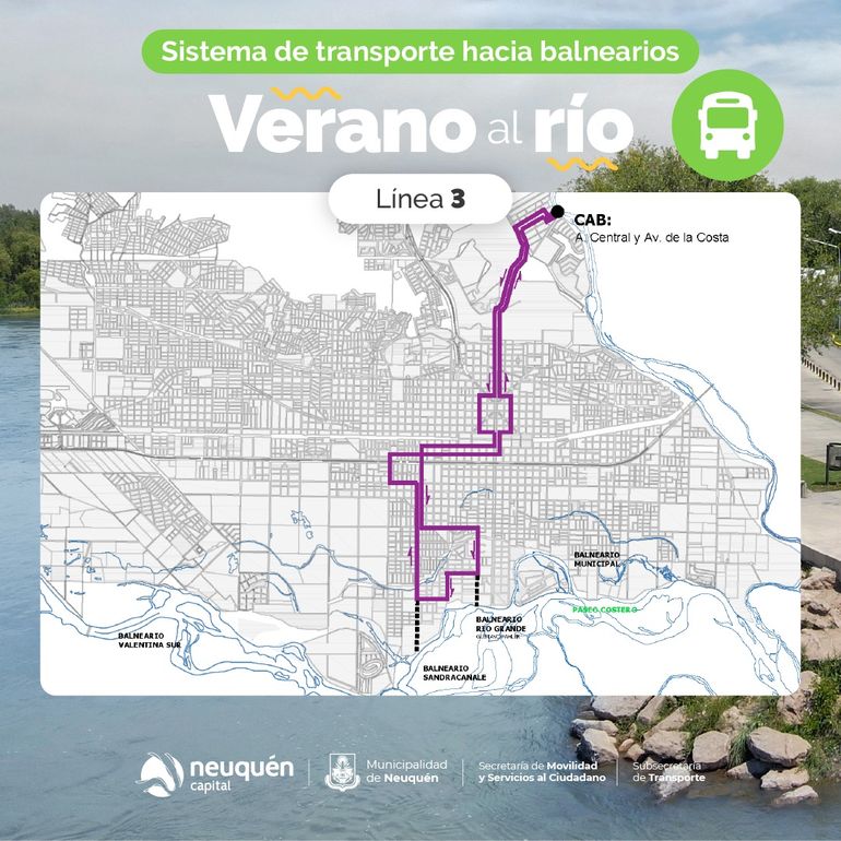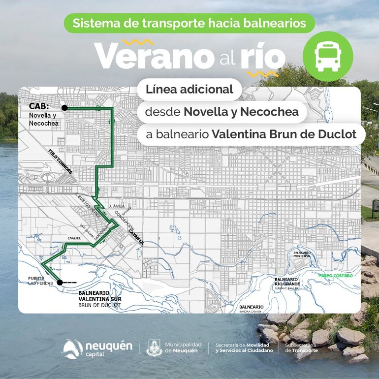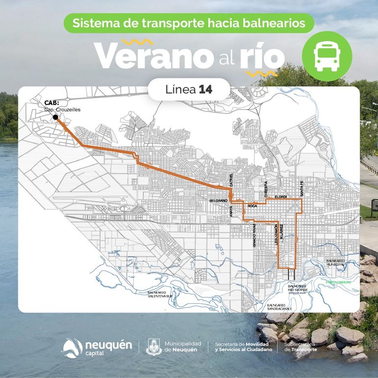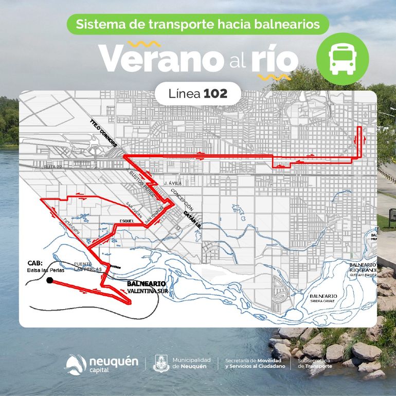 "¡No hay excusas para no ir al río!". Con esa frase la Secretaría de Movilidad y Servicios al Ciudadano de la Municipalidad de Neuquén anunció en las redes sociales el programa de transporte público que desde este sábado 10 de diciembre comenzará a funcionar en el marco del servicio Verano al río.