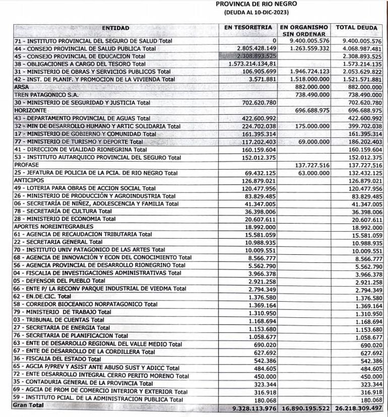 En un balance que se difundió, la gestión Weretilneck encontró en Tesorería un total de 9.328.113.976 pesos, fondos sin ordenar por 16.890.195.522 pesos y un total de deuda de 26.218.309.497 pesos. El balance discrimina montos en ministerios, organismos y empresas del Estado y secretarías, entre otros.
