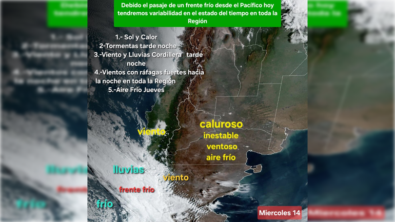 El pasaje de un frente frío proveniente del océano Pacífico generará un marcado cambio en las condiciones del tiempo en gran parte de la región, con una fecha caracterizada por el calor, inestabilidad y fuertes vientos, seguida por el descenso de temperaturas.