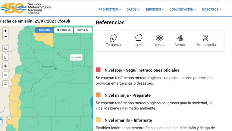 El Servicio Meteorológico Nacional (SMN) emitió una alerta amarilla por nevadas para la cordillera de Huiliches, de Lácar y del sur de Aluminé. Dado el nivel de alerta, se indicó que el área será afectada por nevadas persistentes, algunas localmente fuertes. Desde el SMN estimaron valores entre 20 y 35 cm, pudiendo ser superados en forma puntual.