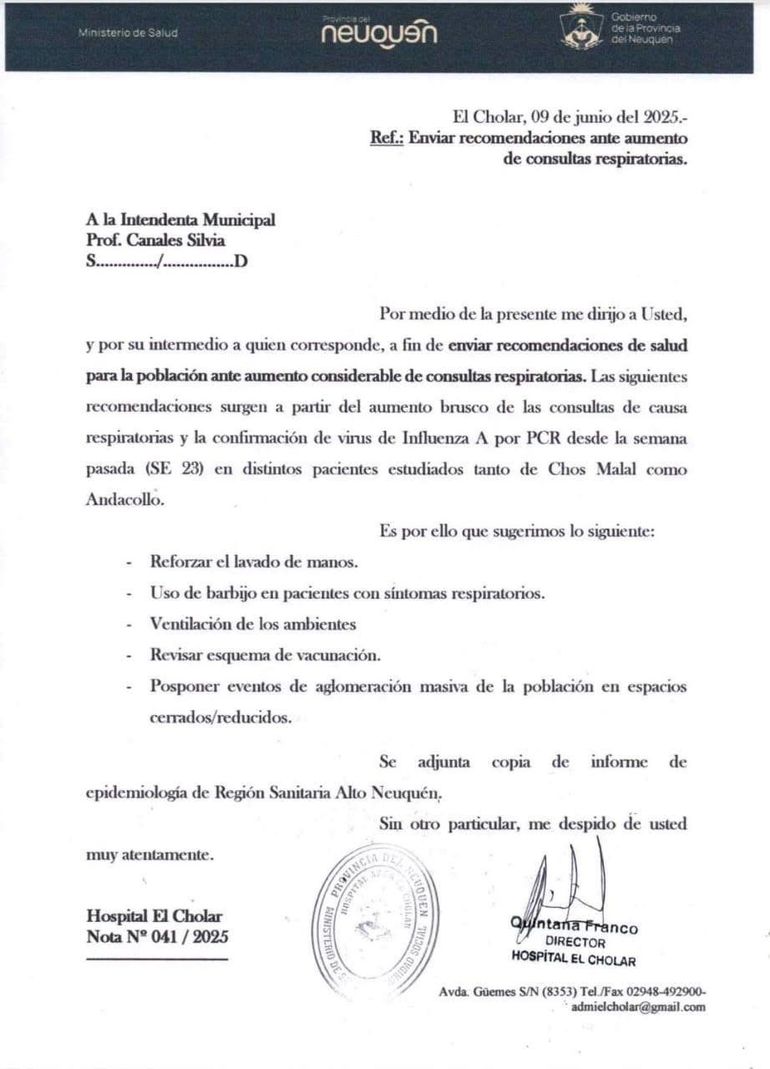 El director del Hospital El Cholar, Franco Quintana, fue quien firmó el comunicado enviado a la intendenta Silvia Canales, instando a la difusión de estas recomendaciones en los ámbitos municipales y comunitarios. En paralelo, el epidemiólogo Pablo Zárate hizo lo propio en su rol como coordinador regional, dirigiéndose a los hospitales y centros de salud de la Zona Sanitaria III.