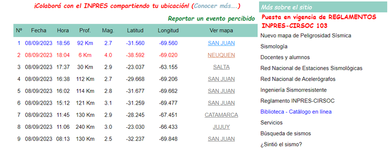 Más tarde lo hizo el Instituto Nacional de Prevención Sísmica (INPRES), con otros valores. Informó un sismo de 4 ML de magnitud y de 6 kilómetros de profundidad, localizado a 92 kilómetros al noroeste de Neuquén.