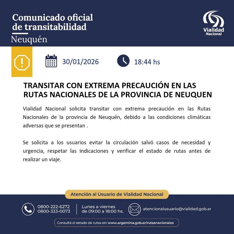 Vialidad Nacional informó pasadas las 22, que se debe transitar con extrema precaución sobre la Ruta Nacional 40 Norte, en el tramo comprendido entre la ciudad de Las Lajas y el límite con la provincia de Mendoza, debido a las complicaciones generadas por las condiciones climáticas adversas que afectan a la región.