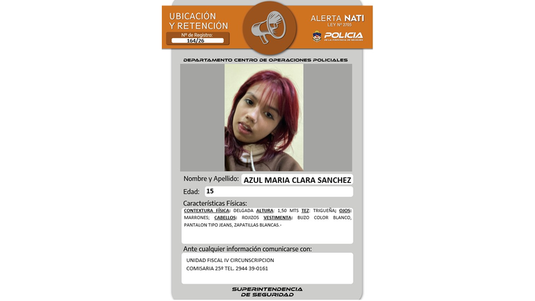 La búsqueda de Azul María Clara Sánchez se enmarca en el protocolo de la Alerta Nati de la Ley N° 2705, que se activa en casos de desaparición de niñas, niños y adolescentes de menos de 18 años para agilizar su localización.