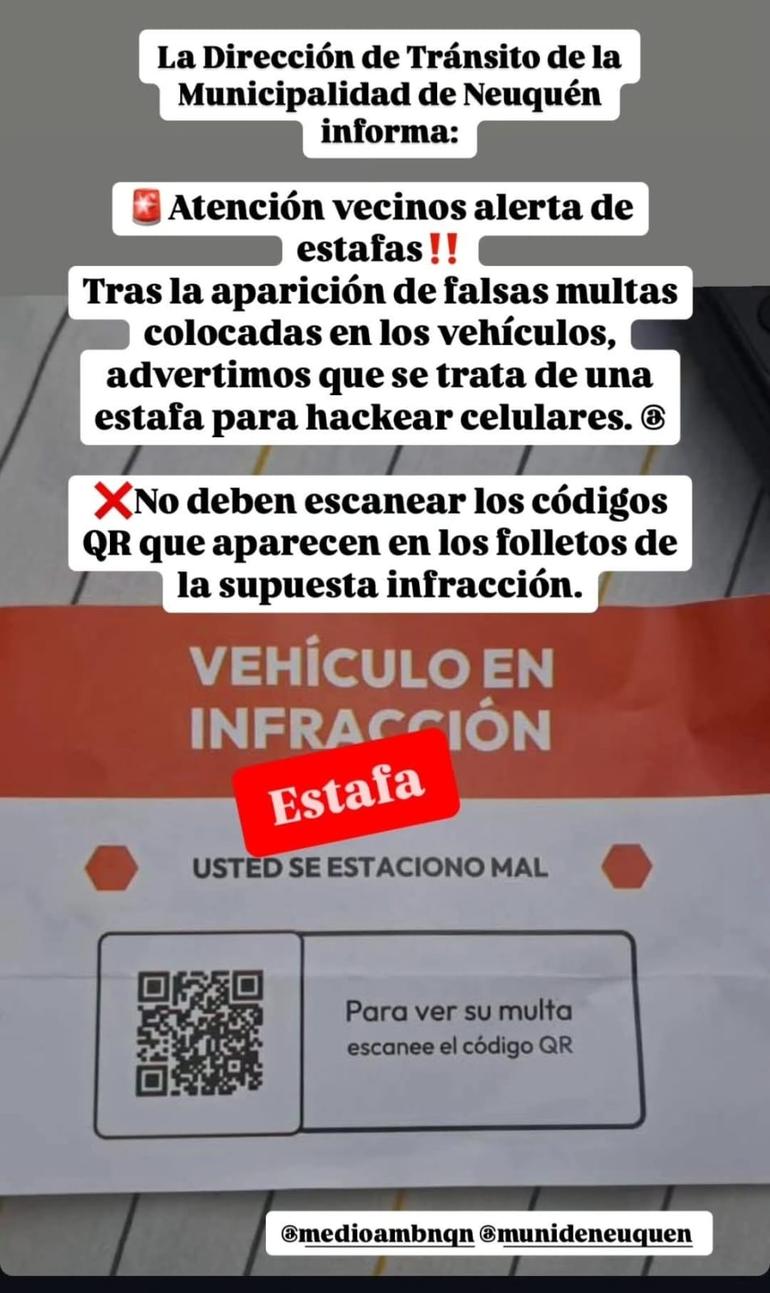 La Dirección de Tránsito de la Municipalidad de Neuquén emitió un urgente llamado a la comunidad para alertar sobre una nueva modalidad de estafa que ha comenzado a circular en la ciudad. Se trata de falsas multas de tránsito que son colocadas en los parabrisas de los vehículos, con el objetivo de engañar a los conductores y hackear sus celulares.