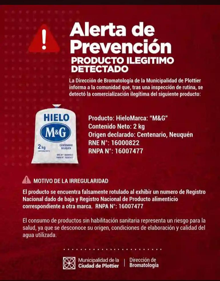La Municipalidad de Plottier emitió en las últimas horas una advertencia sanitaria dirigida a toda la comunidad luego de detectar la comercialización de un producto de hielo con irregularidades en su rotulación. El hallazgo se produjo en el marco de controles de rutina realizados por la dirección de Bromatología, que alertó sobre los riesgos que implica el consumo de productos sin habilitación.
