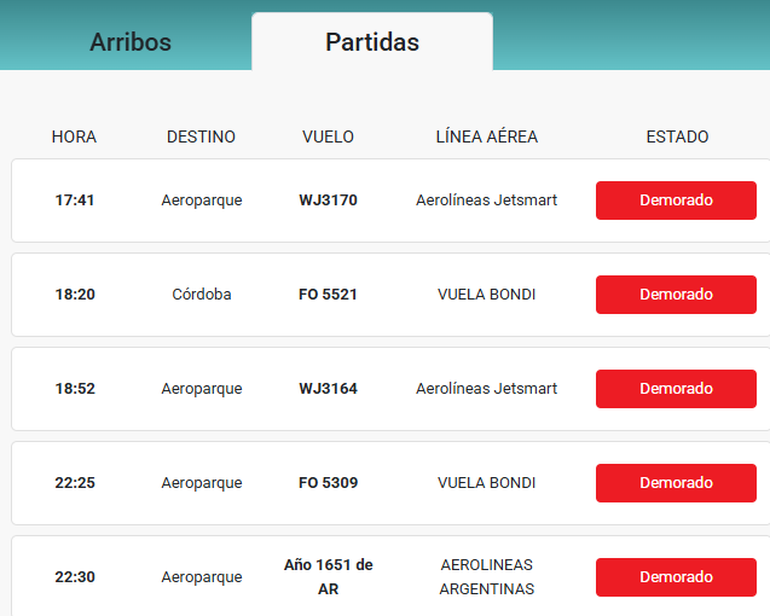 Con arribos demorados, también se dilata la salida e otros vuelos que tienen origen en el Aeropuerto de Neuquén y van a Buenos Aires o Córdoba. Hay cinco partidas afectadas, entre las 17:41 y las 22:30, el último, de Aerolineas Argentinas.