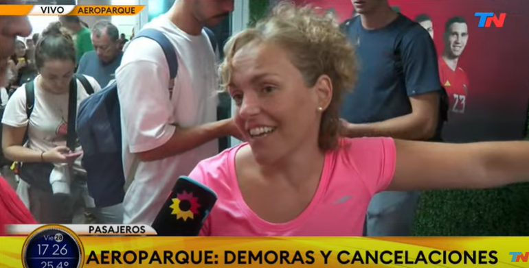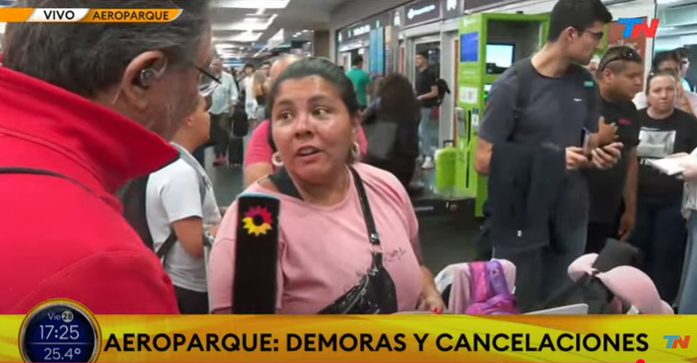 Algunos pasajeros esperaban resignados en Aeroparque la salida de su vuelo. "Tenemos que viajar a Florianopolis por Jetsmart. Ibamos a salir 16:55 y ahora vamos a salir 19:55. En el mismo vuelo, pero se demoró dos horas más por cuestiones climáticas", comentaron a las cámaras de TN.