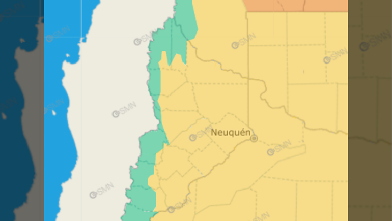 El organismo dependiente del Ministerio de Defensa difundió que "el área será afectada por tormentas, algunas localmente fuertes. Se espera que las mismas estén acompañadas de actividad eléctrica frecuente, ráfagas de hasta 60 km/h, ocasional caída de granizo y abundante caída de agua en cortos períodos. Se esperan valores de precipitación acumulada entre 10 y 40 mm, pudiendo ser superados de forma puntual, especialmente sobre la provincia de Neuquén".