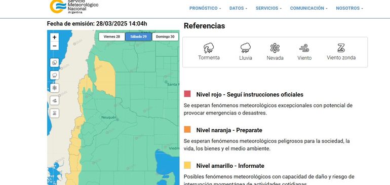 "Se estiman valores de precipitación acumulada entre 15 y 30 mm, pudiendo ser superados en forma puntual", indica el SMN en su Sistema de Alerta Temprana. Comenzará el sábado por la noche y se extendería hasta la mañana del domingo. Las zonas afectadas por estas condiciones son: Cordillera de Aluminé - Cordillera de Chos Malal - Cordillera de Loncopué - Cordillera de Minas - Cordillera de Picunches - Cordillera de Ñorquín.