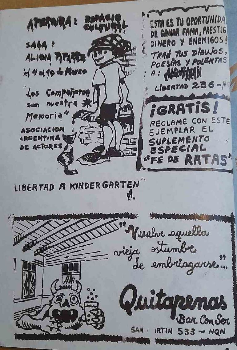 "En aquel entonces eran las épocas finales del alfonsinismo y éramos muchos los jóvenes que teníamos ganas de contestarle al sistema, Nuestra idea era muy antisistema y contracultural, fue creo, uno de los primeros movimientos, o atisbo si querés, que encendió la chispa del undeground acá en Neuquén. Como estábamos también en contra de la industria tratábamos de hacer un producto artesanal. No había un solo ejemplar igual al otro, todos los números eran diferentes y tratábamos de hacer todas las tapas a mano", agregó.