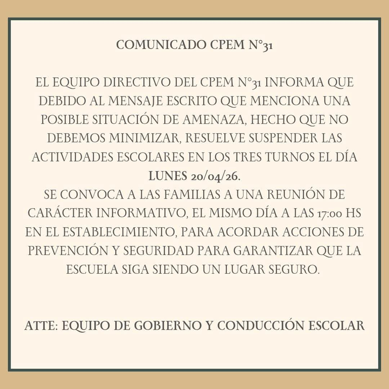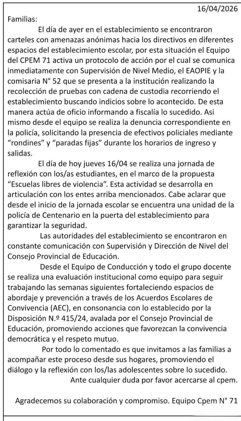 En los últimos días se registraron nuevos episodios en Centenario que se suman a los casos ya conocidos en otras localidades. En el CPEM N°31, el equipo directivo decidió suspender las clases en los tres turnos tras detectarse un mensaje que advertía sobre una posible situación de amenaza. La medida alcanzó a toda la jornada del lunes y estuvo acompañada por la convocatoria a una reunión informativa con familias para definir acciones de prevención y seguridad.
