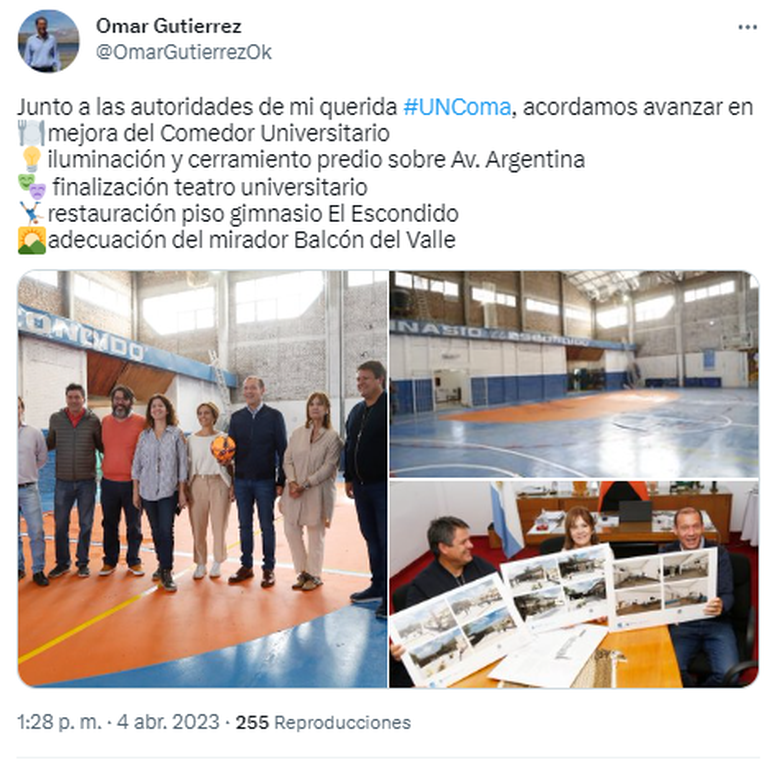 "Recientemente se inauguró la obra de mejoras para el polideportivo, que se ejecutó con un aporte económico del municipio", dijo y contó que también se hizo una contribución económica para mejorar las instalaciones del comedor. Y agradeció a la UNCo y a los estudiantes: "No hay que olvidarse de lo que es nuestra universidad, de cuantas oportunidades nos brinda".