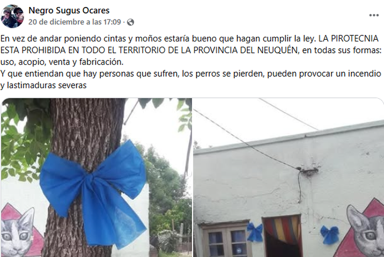 En la previa de Año Nuevo, aparecieron cintas y moños azules en algunas puertas y árboles de la ciudad de Neuquén. Así, vecinos y vecinas se sumaron a una campaña viral en redes que persigue el noble propósito de generar conciencia para que las fiestas no generen daño y sufrimiento.