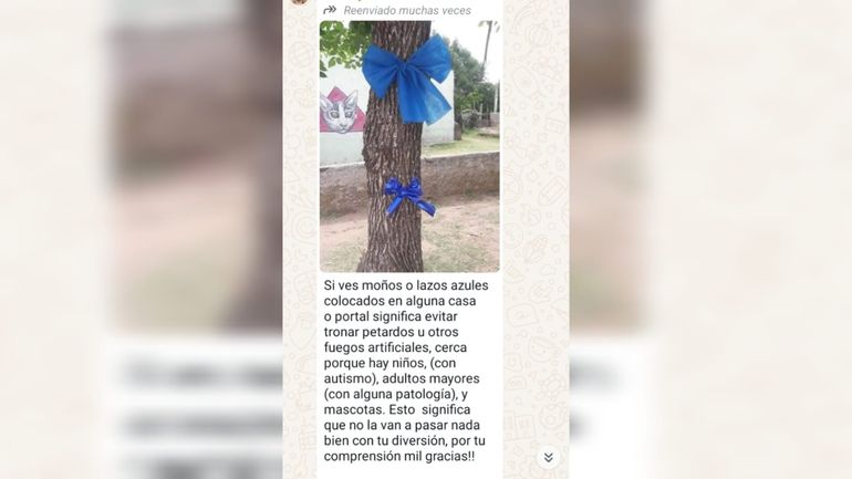 "Si ves moños o lazos azules colocados en alguna casa o portal significa evitar tirar petardos u otros fuegos artificiales cerca porque hay niños (con autismo), adultos mayores (con alguna patología) y mascotas. Esto significa que no la van a pasar nada bien con tu diversión. Por tu comprensión, ¡¡¡mil gracias!! Hagamoslo Viral", dice el mensaje que se compartió miles de veces en distintos grupos de WhatsApp.