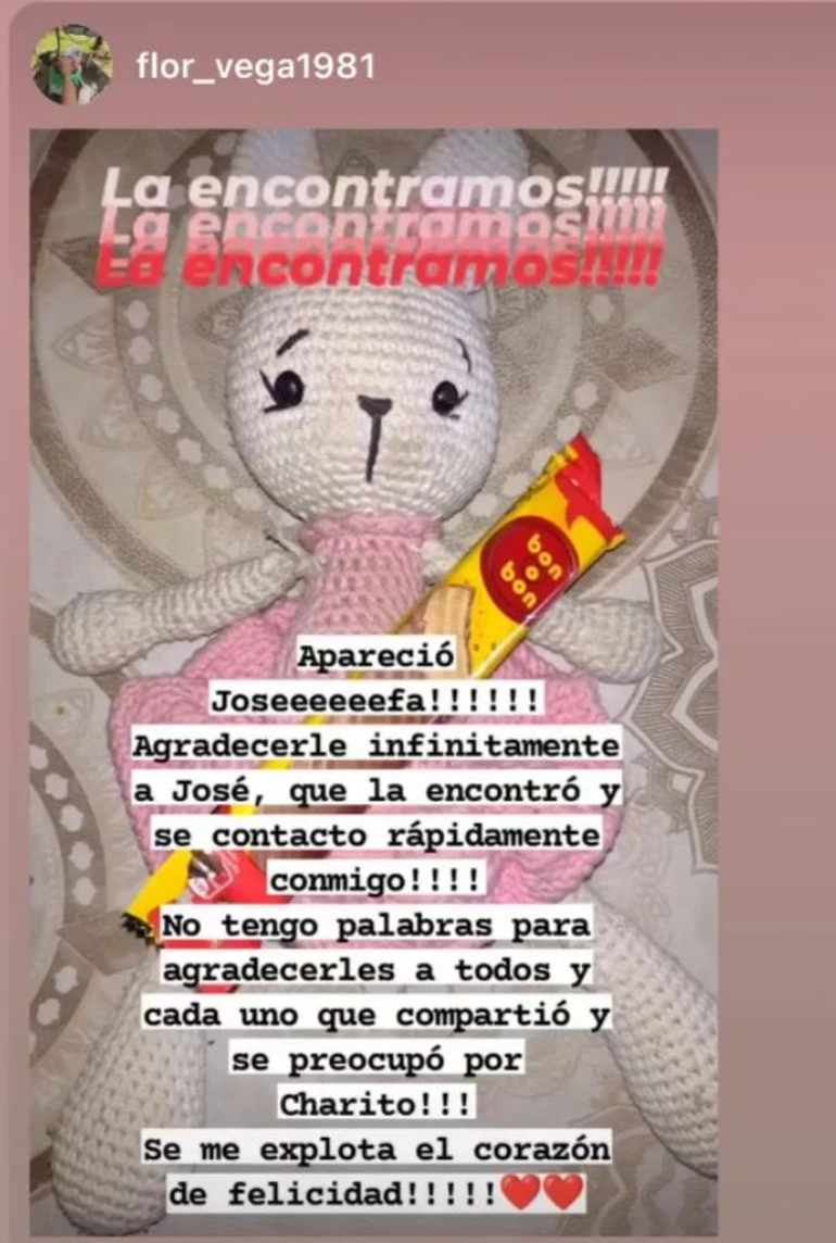 Este miércoles alrededor de las 16, un vecino se contactó con Agustina, la mamá de la nena, y le avisó que la había encontrado. “Estamos tan felices, ya la estamos lavando para cuando mi hija llegue de jardín. Estaba negra porque había estado tirada en la tierra”, contó la madre.