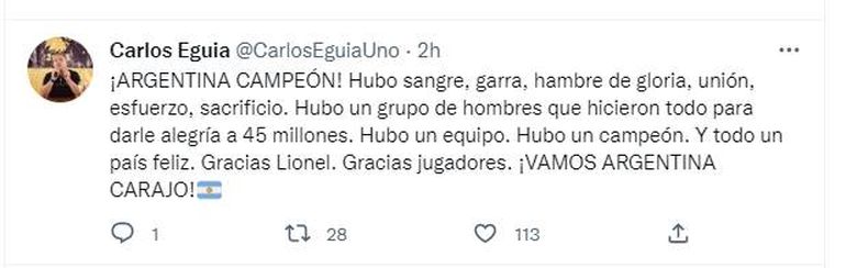 Otro dirigente neuquino que no quiso dejar pasar el momento de alegría fue Carlos Eguía, quien también utilizó Twitter para dejar un mensaje muy reflexivo. “Hubo sangre, garra, hambre de gloria, unión, esfuerzo, sacrificio. Hubo un grupo de hombres que hicieron de todo para darle alegría a 45 millones”, aseveró y continuó: “Hubo un equipo. Hubo un campeón. Y todo un país feliz. Gracias Lionel. Gracias Argentina”.