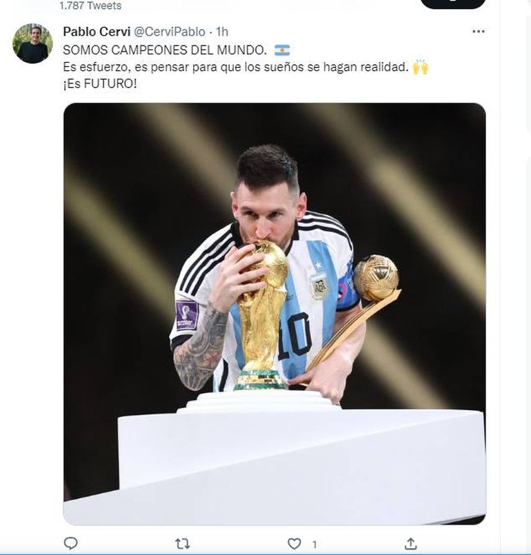 Por su parte, el empresario y dirigente de Juntos por el Cambio, Pablo Cervi, compartió una foto de Lionel Messi besando la copa y escribió: “Somos campeones de mundo. Es esfuerzo, es pensar para que los sueños se hagan realidad ¡Es Futuro!”.