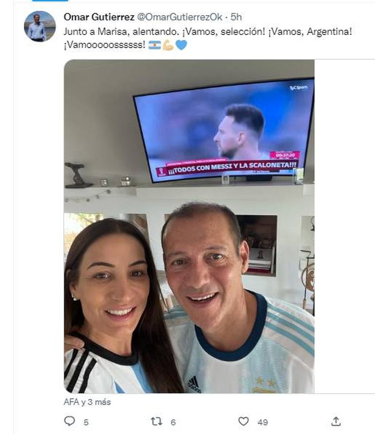 El primero de ellos en dejar un mensaje de aliento fue el gobernador, Omar Gutiérrez, quien minutos antes de que comenzara el partido que coronaría al mejor seleccionado del mundo compartió un tweet en el que se podía a ver de fondo a Messi ya en la cancha. “Vamos selección. Vamos Argentina”, escribió el mandatario, acompañado de una foto sonriente y con la camiseta celeste y blanca.