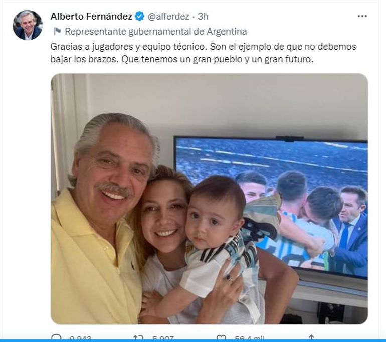 En tanto, a nivel nacional el presidente, Alberto Fernández, fue uno de los primeros en felicitar al seleccionado que ganó la tercera copa de fútbol del mundo para Argentina. "Gracias a jugadores y equipo técnico. Son el ejemplo de que no debemos bajar los brazos. Que tenemos un gran pueblo y un gran futuro", twitteó apenas terminó el partido.