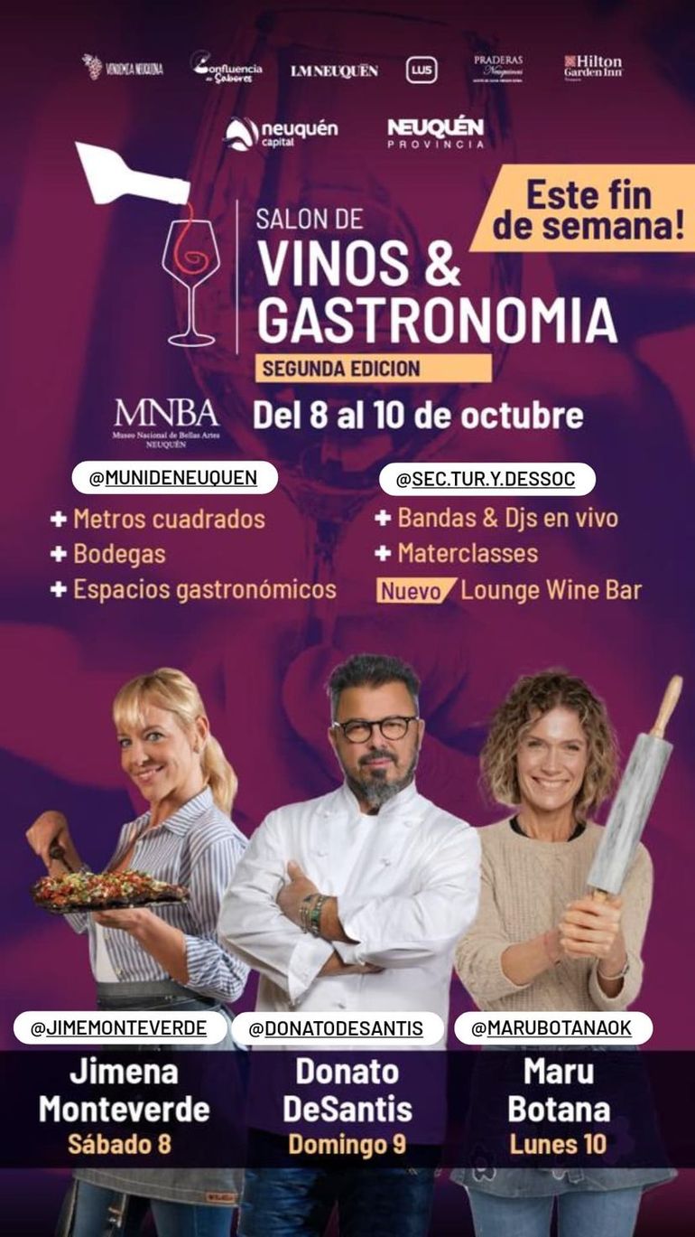 Este sábado por la tarde arranca en el Museo Nacional de Bellas Artes (MNBA) la segunda edición del Salón de Vinos & Gastronomía con la presencia de prestigiosas bodegas y de Donato De Santis, Maru Botana y Jimena Monteverde, referentes internacionales de la cocina, y de los chefs más importantes de Neuquén.