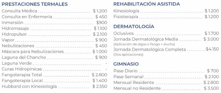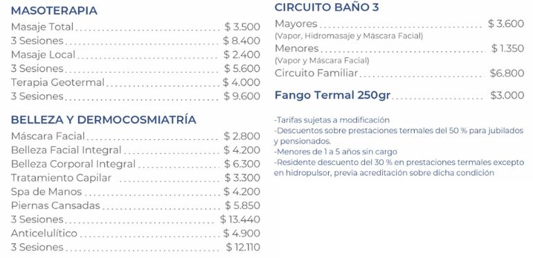 Tal como se precisa en el tarifario, los precios están sujetos a modificación. Los residentes de la provincia tienen un descuento del 30 por ciento en las prestaciones termales, excepto en hidropulsor. Para jubilados y pensionados el descuento es del 50 por ciento, mientras que los menores de 1 a 5 años pueden acceder en forma gratuita.