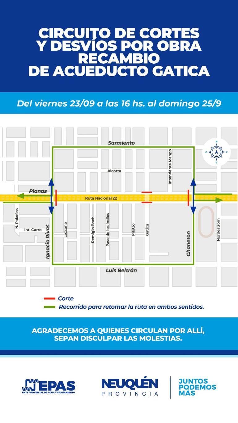 En función de esta decisión se realizó un plan de trabajo y señalización que fue aprobado por Vialidad Provincial y la Municipalidad de Neuquén. El mismo permite la interrupción del tránsito durante el fin de semana. Esta acción posibilitará ejecutar las tareas excavando la cinta asfáltica y colocando la cañería desde la misma. Esto permitirá realizar la maniobra en forma ágil.