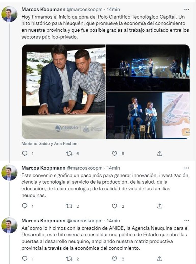 Durante el discurso, Gaido dijo: “Estoy orgulloso como neuquino de trabajar en conjunto con Ana Pechen, quien desde que fue rectora y vicegobernadora de la provincia, con Marcos Koopmann que va a ser el próximo gobernador de la provincia y ahora es vicegobernador, porque tenemos el mismo proyecto”.