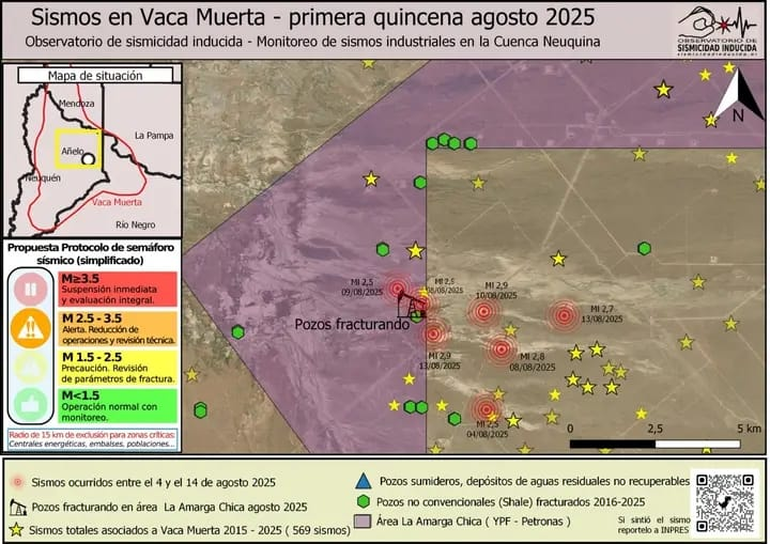 "La sismicidad de la primera mitad del mes de agosto, tal como se observa en el mapa, estuvo asociada a pozos fracturando en el área La Amarga Chica (YPF - Petronas) en cercanías de Añelo; y El Trapial (Chevrón Argentina SRL) en cercanías de Rincón de los Sauces", detallaron.